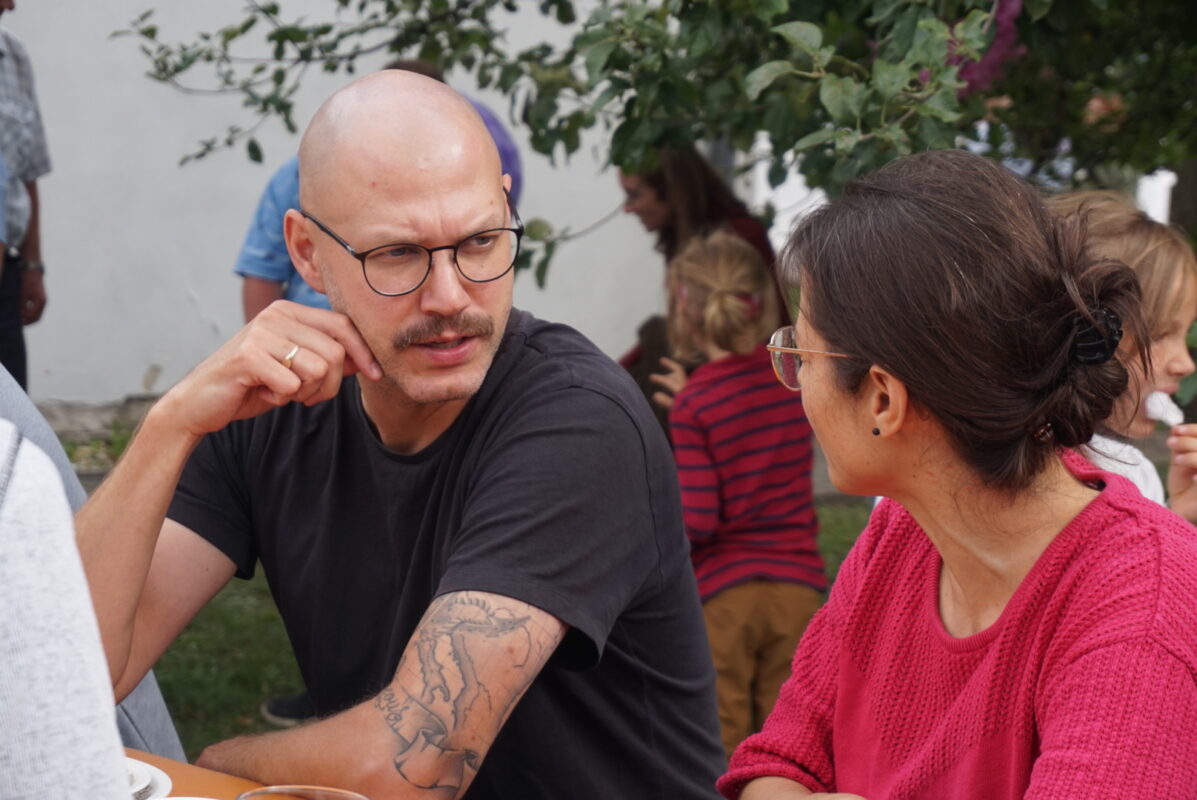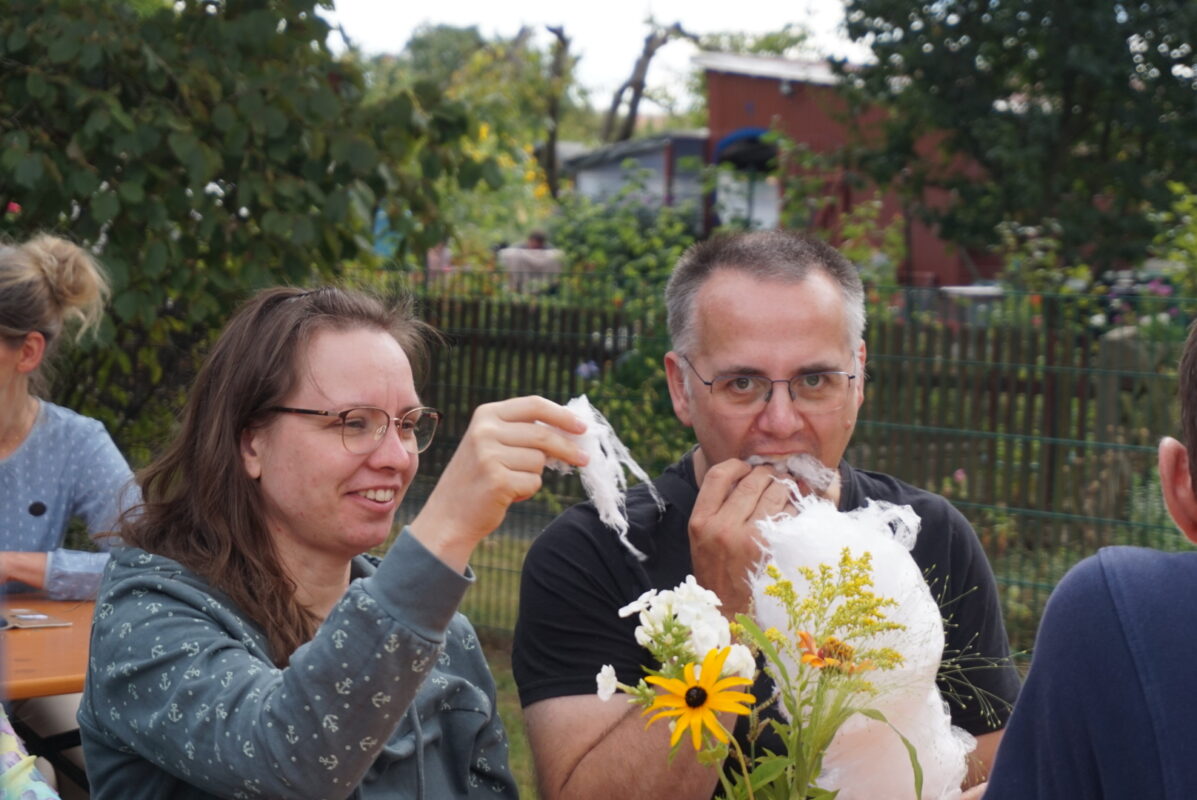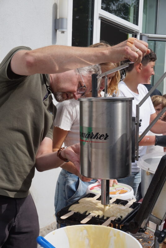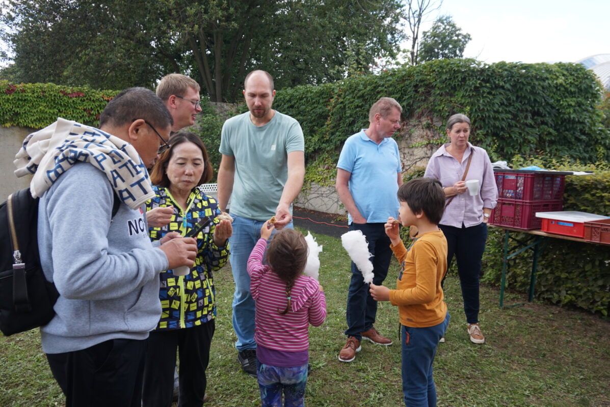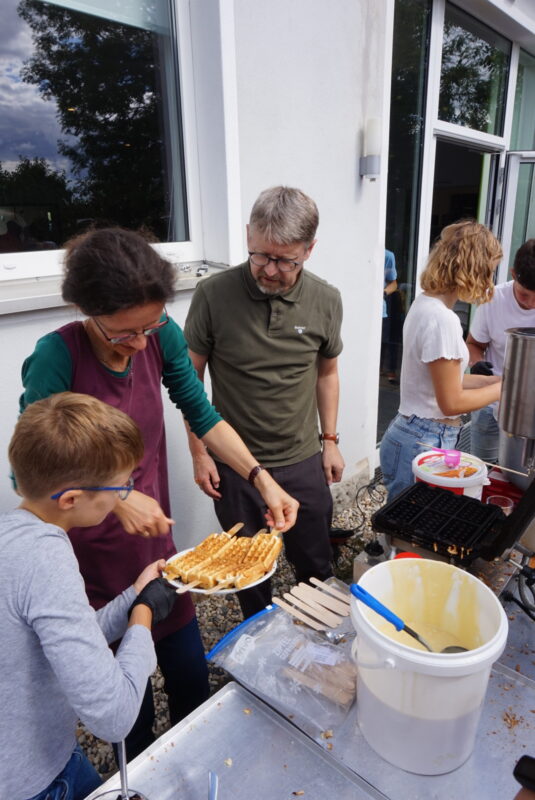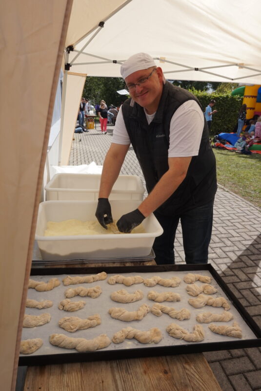 Nach dem gemeinsamen Mittagessen – jeder konnte etwas zum Buffet beitragen – begann das diesjährige Gemeindefest. Überall auf dem Gelände des Forum Hoffnung war zu spüren, wie wichtig Gemeinschaft ist und wie gut sie allen tut. Im Außenbereich nutzten Kinder und Jugendliche die vielfältigen Bewegungsspiele. Die eigens dafür aufgebaute Hüpfburg kam bei den Jüngeren besonders gut an. Zudem gab es Bastelangebote – an einem Tisch backten fleißige Helfer Waffeln am Stiel oder drehten Zuckerwatte. An einer anderen Station gab es frisches Wurzelbrot aus dem Holzofen, dass man unter Anleitung auch selbst herstellen konnte. Überhaupt kam so ziemlich jedes Leckermaul auf seine Kosten. Denn neben den bereits erwähnten Köstlichkeiten gab es zur Eröffnung des Kaffeetrinkens eine riesige Verabschiedungstorte für unseren Pastor.