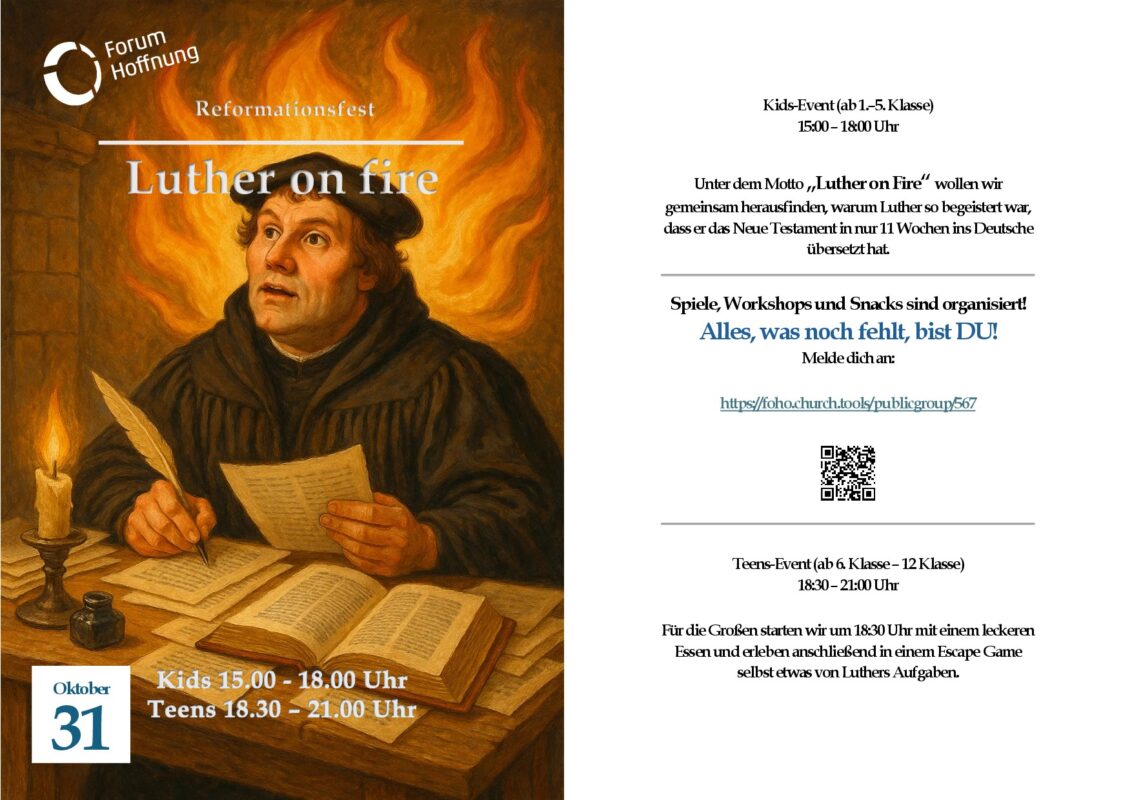 Unter dem Motto „Luther on Fire“ wollen wir gemeinsam herausfinden, warum Luther so begeistert war, dass er das Neue Testament in nur 11 Wochen ins Deutsche übersetzt hat.